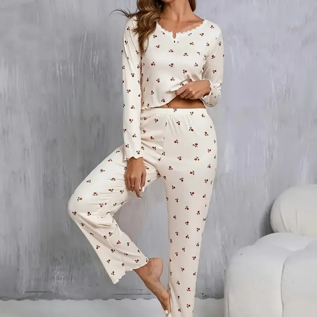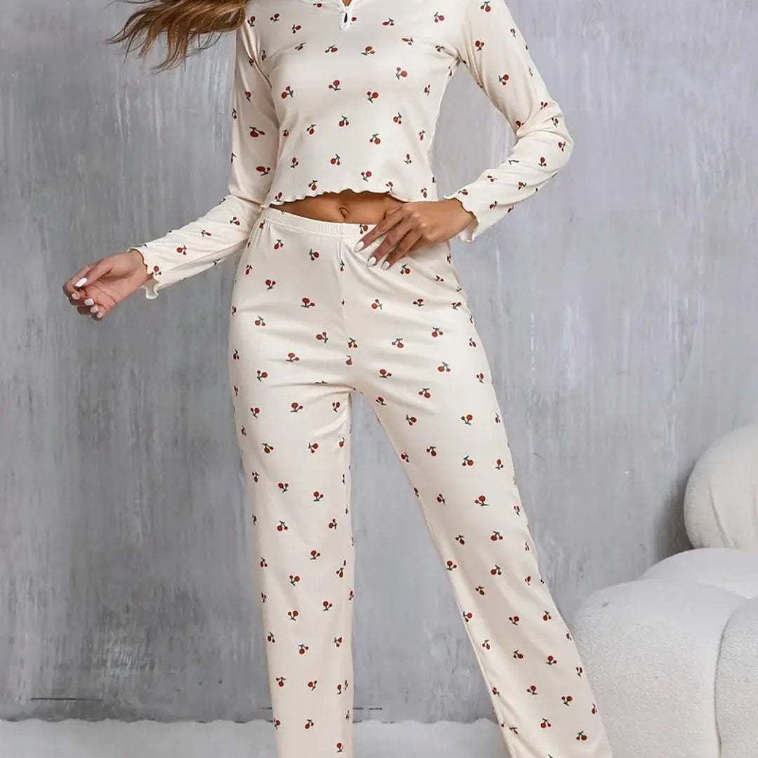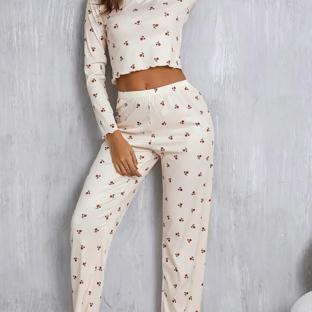 - Diseño: Blusa manga larga con estampado de cerezas + pantalón con pretina elástica
